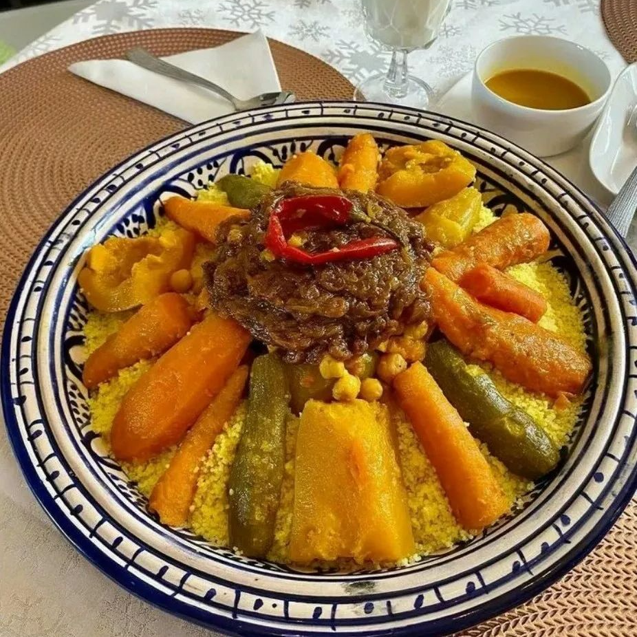 Tunisian Couscous is Friday's blessing; tiny pasta pearls steamed to fluffy perfection, topped with seasonal stews that might feature lamb with turnips in winter or fresh vegetables in summer. The broth, enriched with harissa and preserved lemons, brings North African warmth tempered by citrus brightness.
