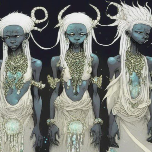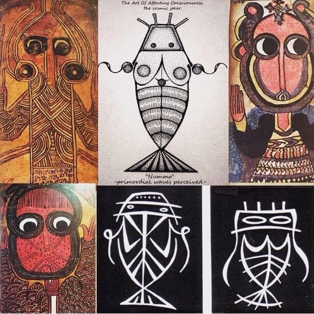 The Nommo are amphibious, fish-like beings with humanoid upper bodies. According to Dogon cosmology, they came from a world circling Sirius, the Dog Star, and were the first living creatures. They were created by the supreme god Amma and were born as pairs of twins, perfectly balanced and representing order, harmony, and the correct way of being. Water was their element, and speech was their gift.