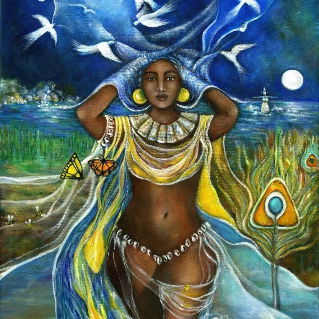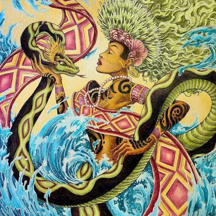 Her appearance is as fluid as water. Sometimes she has a fish tail, sometimes snakes wrapped around her body, sometimes she's just a beautiful woman with long flowing hair. Her origins blend African water spirit traditions with European mermaid images from trading ships in the 15th century.